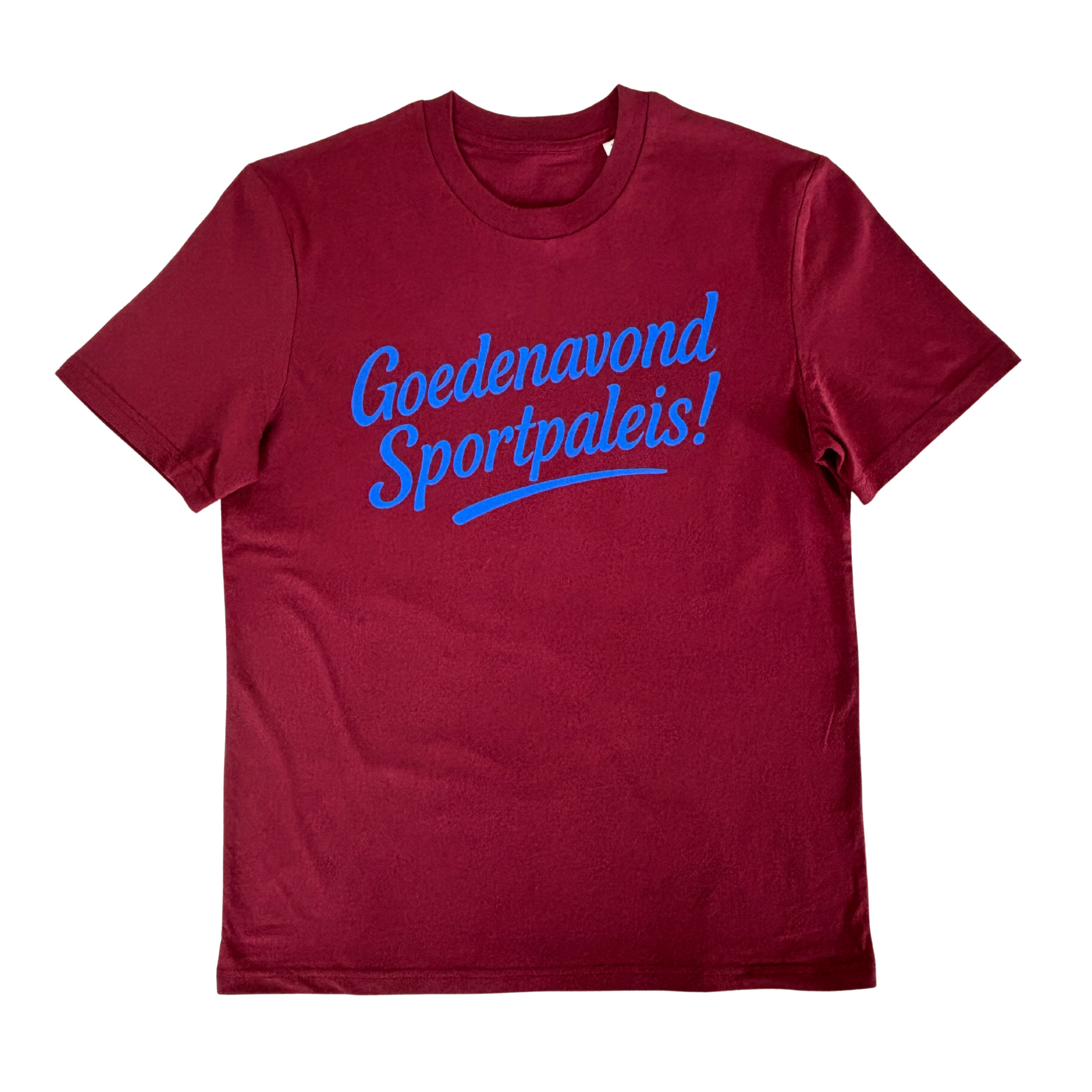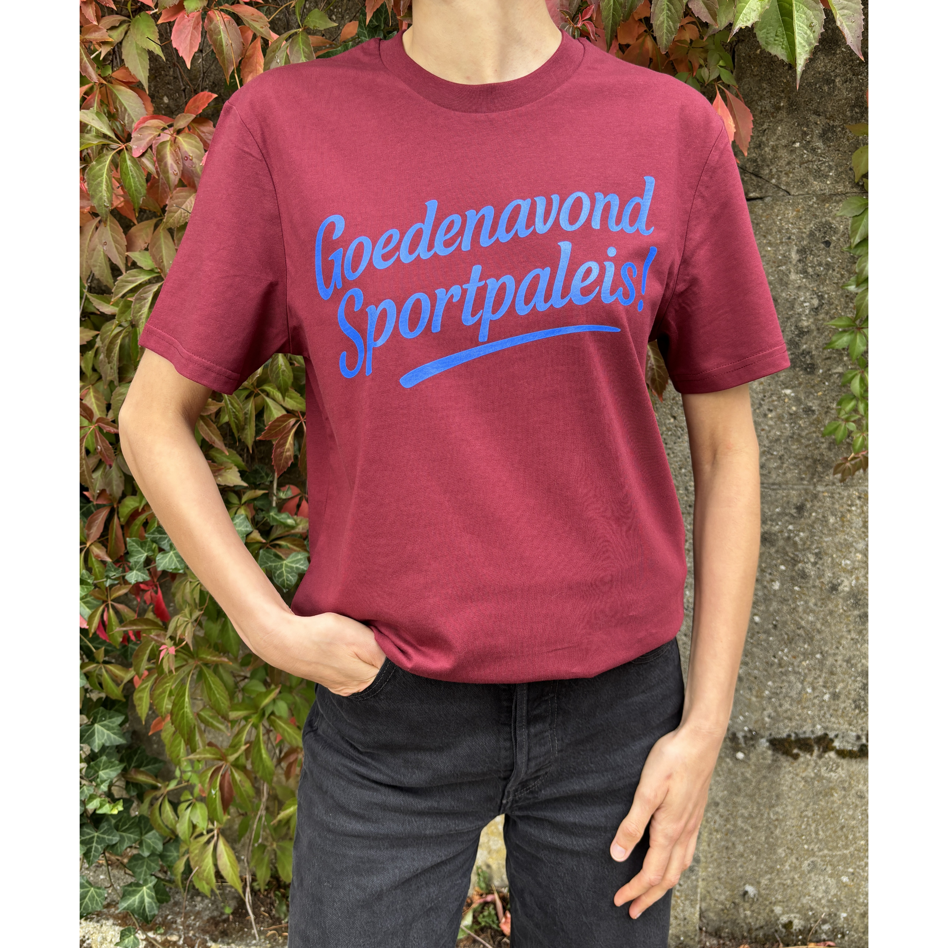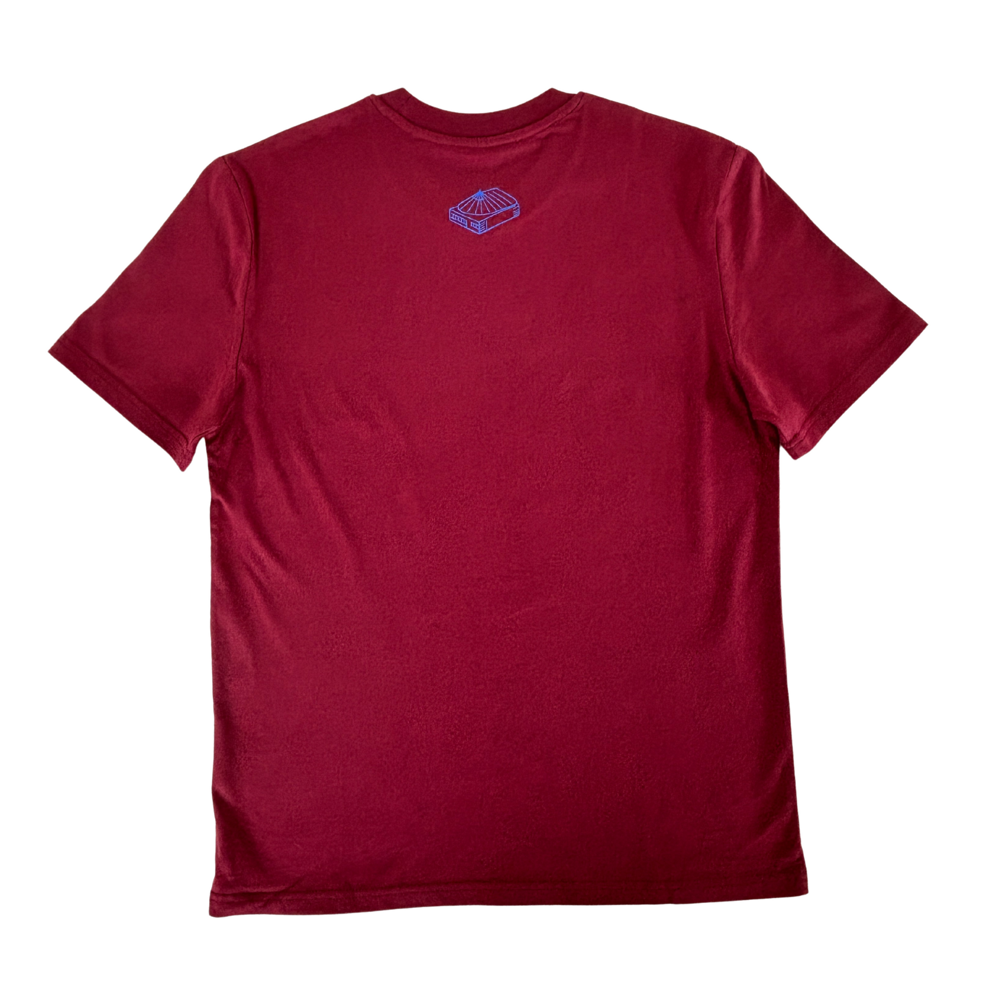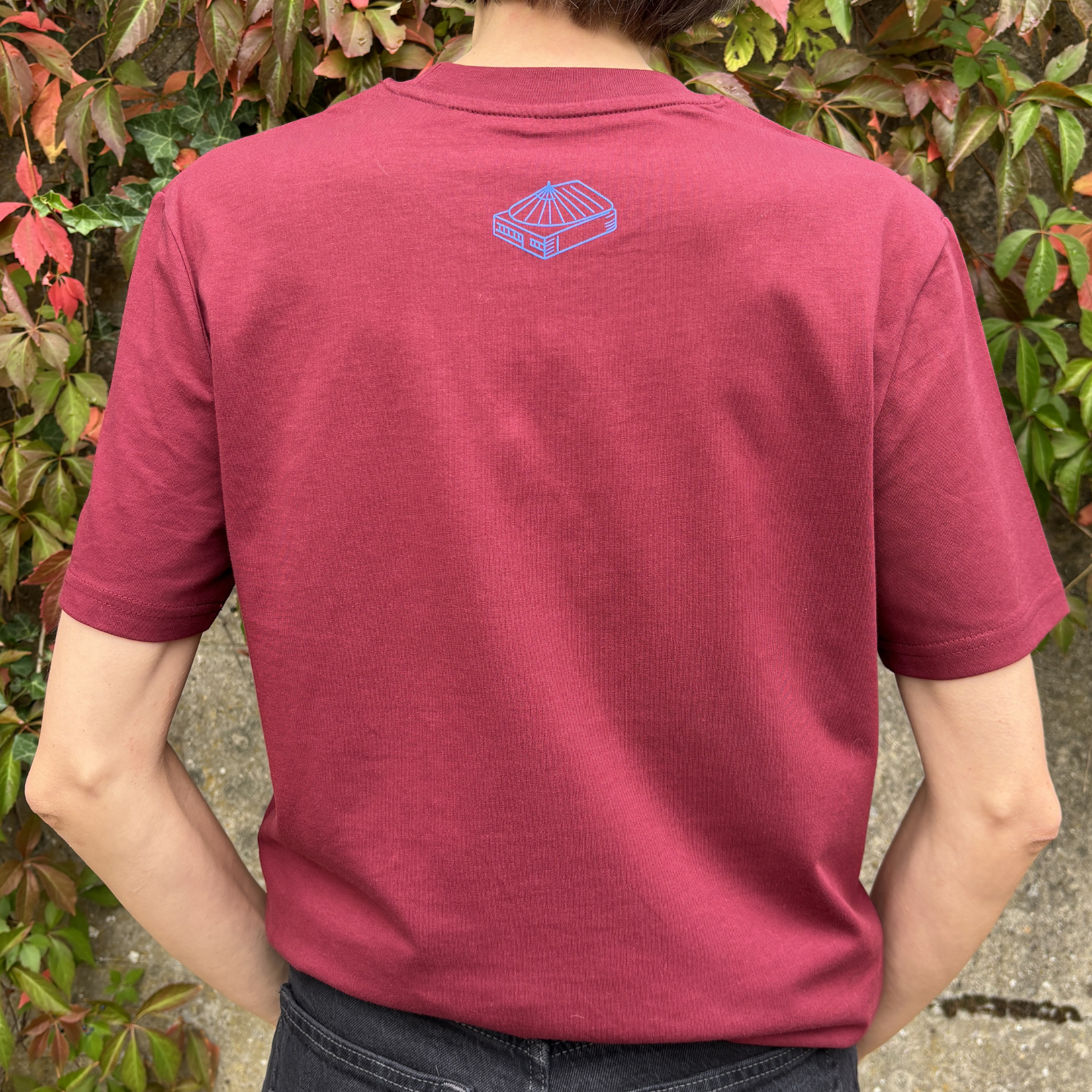 Bordeaux T-shirt met zeefdruk in electric blue.